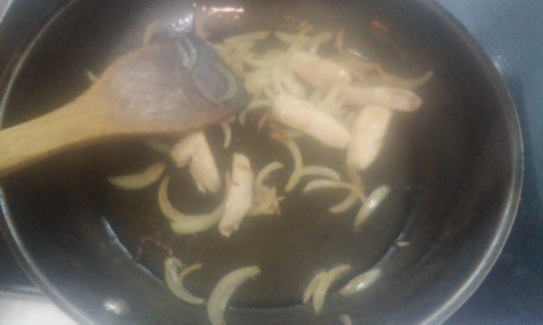 Как посветлеет курица, добавляем лучок, нарезанный соломкой