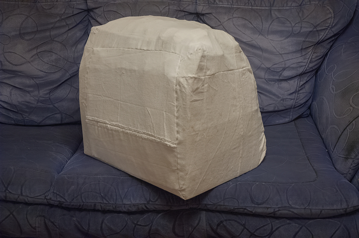 Несколько слоёв картона проложенных мятой бумагой и затянутых в стретч-плёнку дополнительно были обшиты толстой мешковиной: