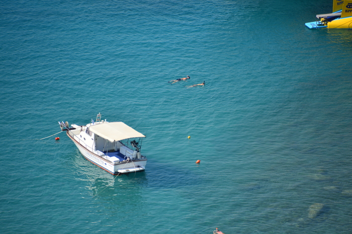 На четвёртый день щёлкнуло: «А давай-ка лодку снимем!» Берём моторку на три часа, выкатываем за буйки и — «Газ в пол, прощай, берег!» До этого я сидел в лодках только на вёслах — как в старом советском фильме про любовь под баян. А тут 30 узлов, примерно 55 км/ч! Море понимаешь сразу — не австрийский автобан, а каждая волна как встречный дальнобой с кирпичами. Но мы не промахи — нарезали бухты, покупались, визжали с сыном как подростки.