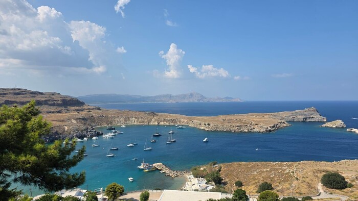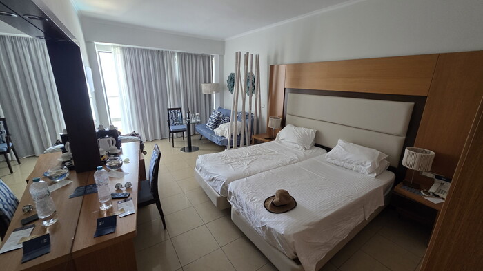 После Родоса мы, как ошалевшие ломанулись на юг острова — в своё логово, отель TUI BLUE Lindos Bay, что стоит впритык к городку Линдос. И надо признать, место оказалось на редкость приличное. Самое сладкое — номер нам впарили выше классом, чем мы бронировали. Видимо, или жара мозги расплавила, или администратор в момент заселения думал о чём-то другом.