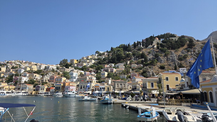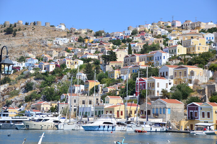 Следующая точка — Сими. Из Родоса туда плывёт паром. Начинаем с Гиалоса — это порт на острове. Милый, живописный, как открытка с бухими котами.