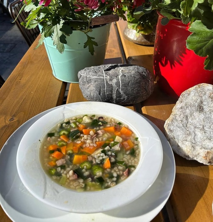 Блюдо из альпийской деревенщины (Австрия, Бавария, Богемия). Ячмень там рос в любых условиях — хоть на камнях, хоть на дедовой лысине. Пожрать для бедных: перловка — дешман, но питательная, а хранится как водка в морозилке. Варили суп из остатков: кость, морковка, лук и если совсем праздник — кусочек мяса, с которого три поколения мышей сосали жир.
