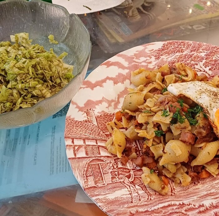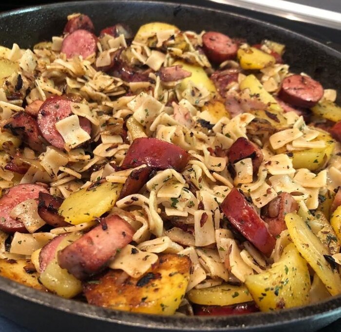 Родился этот кулинарный шедевр в деревенской логике «ничего не выкидывай». После воскресного жаркого оставались остатки — и бабка Ханна их тупо швыряла на сковородку. Раз, два — и готово: сытно, жирно, воняет мясом и луком — то, что надо для мужика, который весь день таскал дрова или лакал шнапс.