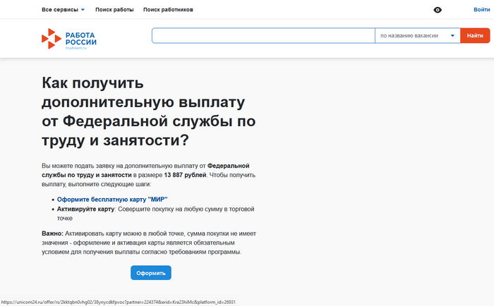 Сайт почти копия официального портала, но кнопка "Все сервисы" даже не активна, и хотя большинство ссылок ведут на trudvsem.ru, но для получения выплаты предлагается перейти по реферальной ссылке на unicom24.ru для оформления кредитной карты: