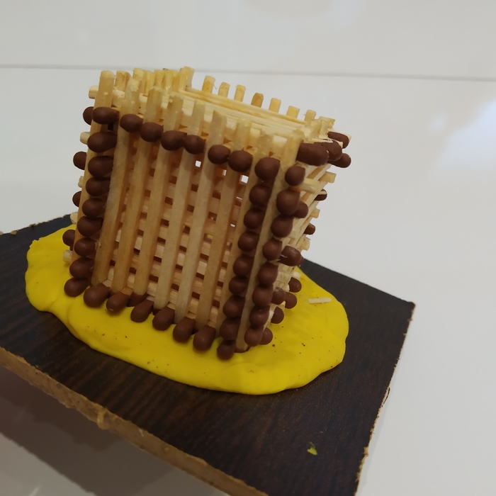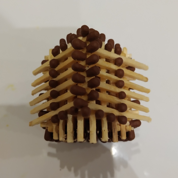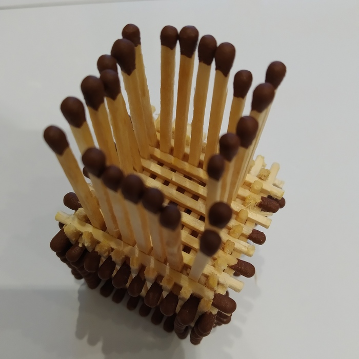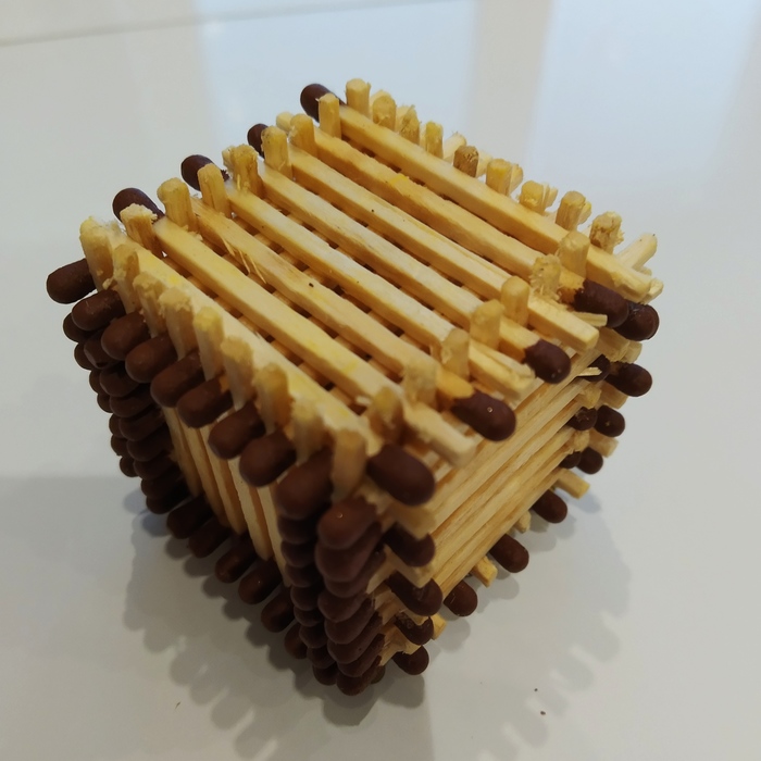 Ещё раз переворачивая и используя стол как опору (если пальцы слабые ) поджимаем сверху,с боков, с зади. Основа готова. Из таких кубиков можно строить весьма немалые сооружения, соединяя так же спичками. Сняв серу, до половины воткнуть в кубик, пинцетом заправить в другой и сдвинуть на встречу.