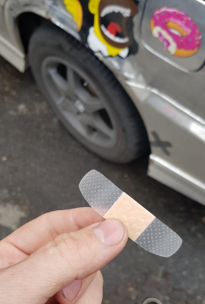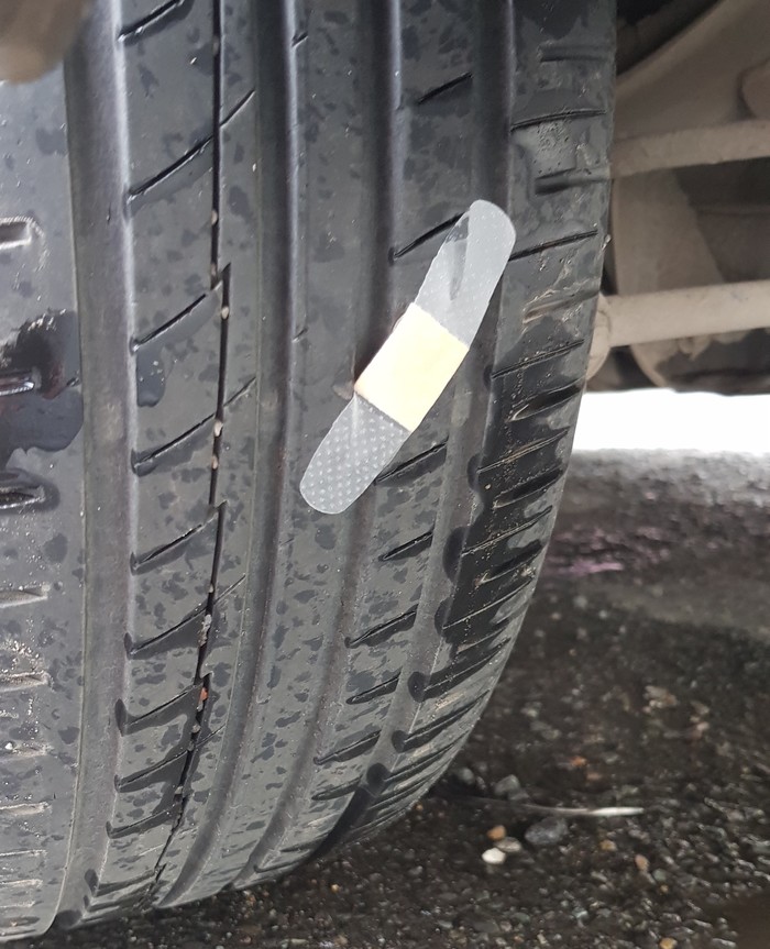 Проехал в итоге примерно километров 10 далеко не по прямой. Спустя пару часов доехал до шиномонтажки. Пластырь был на месте. Монтажник минут пять ржал, потом минут 5 плакал пока отрывал пластырь. Тот оказывается держался до конца и не собирался отступать. Думаю, можно было не заезжать на монтажку 😅