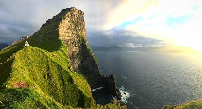 Пейзаж, окружающий маяк на острове Калсой поистине драматичен: скалистые утесы, покрытые густым ковром зеленой травы, небо, сливающееся с морем, вот что так тянет искателей приключений и путешественников на Фарерские острова.