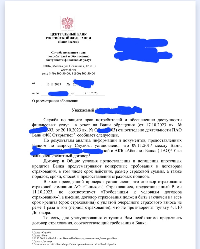 Ранее Продолжение. Банк Открытие отказывается принимать договор страхования ипотеки