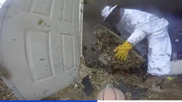 В середине видео Веррет продемонстрировал матку, которая пыталась спрятаться в остатках гнезда. В конце он показывает разрушенные соты, выложенные на лужайке перед сараем.
