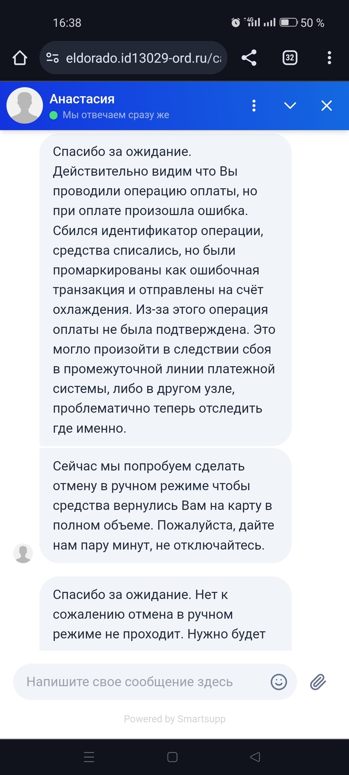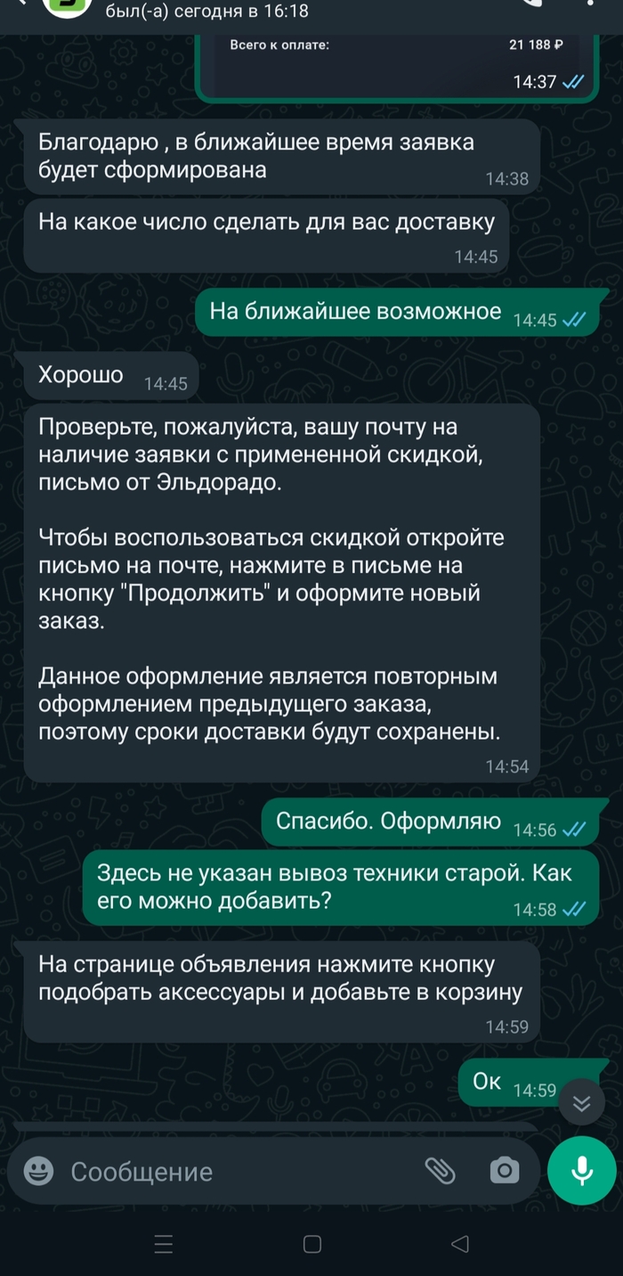 Спустя 2 дня, 4 апреля мне в вотсап приходит сообщение от сотрудника Эльдорадо следующего содержания