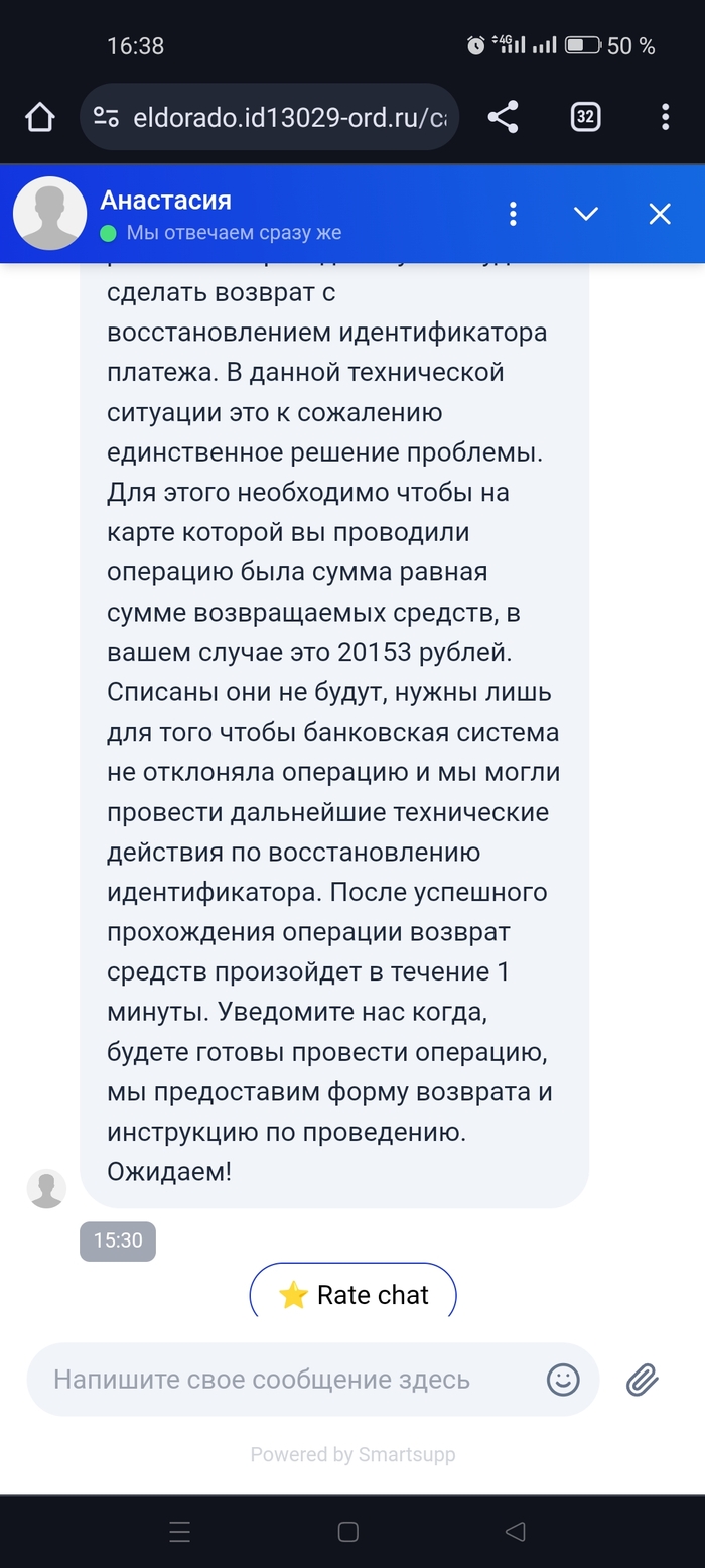 На этом моменте у меня закрались жёсткие сомнения в том, что этот Эльдорадо - настоящий. Я написала в форму связи в непосредственно моём приложении Эльдорадо, просила уточнить, реально ли их сотрудник мне писал и необходимо ли выполнять требования саппорта с сайта.