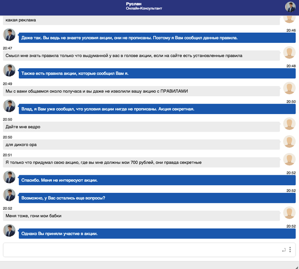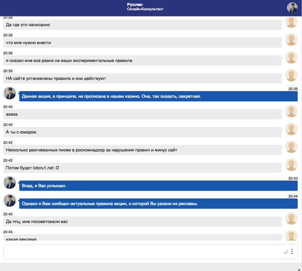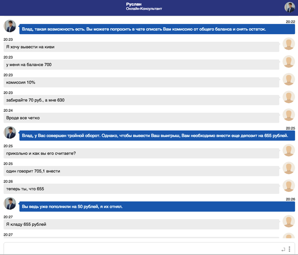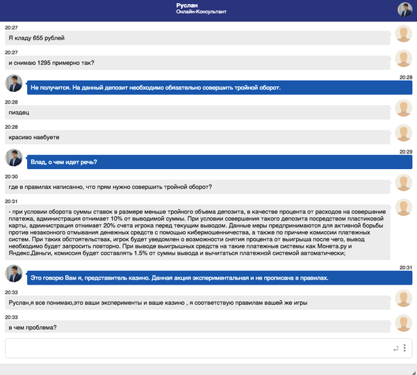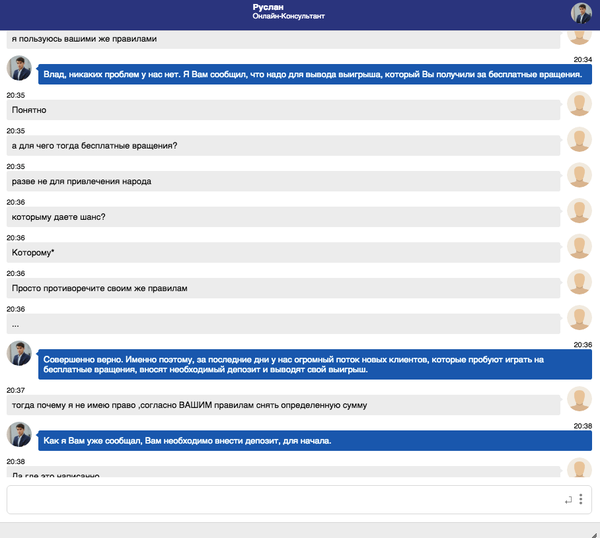 Суть такова решил сыграть на одном сайте, как говорится в рекламе дается 5 бесплатных спинов(игр), с этих 5 игр разыгрался до 700 рублей, решил остановиться и вывезти деньги, но не так все просто, для вывода нужно было подтвердить номер пройти идентификацию по паспорту и сделать первый депозит, проделав все это создал заявку на вывод средств, мне её отменили, после этого произошел диалог со службой поддержки (читать ниже)
