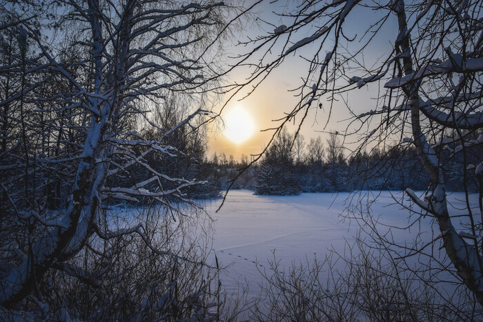 Выхожу к небольшому озеру. Встретил одинокого лыжника. Первый человек после электрички за сегодня. Поздравили друг друга с Новым годом, далее он побежал, а я пошел дальше.