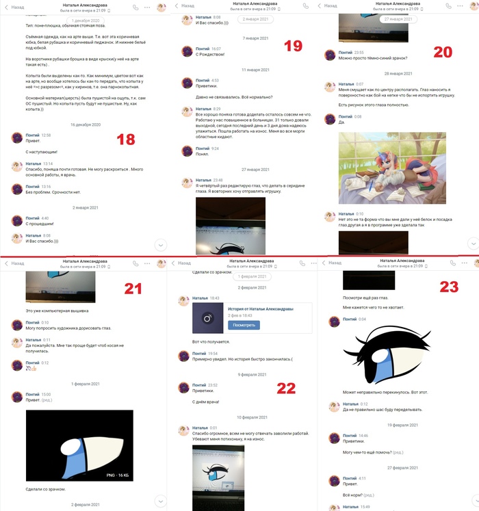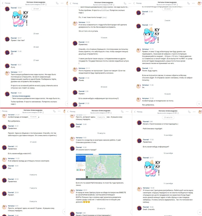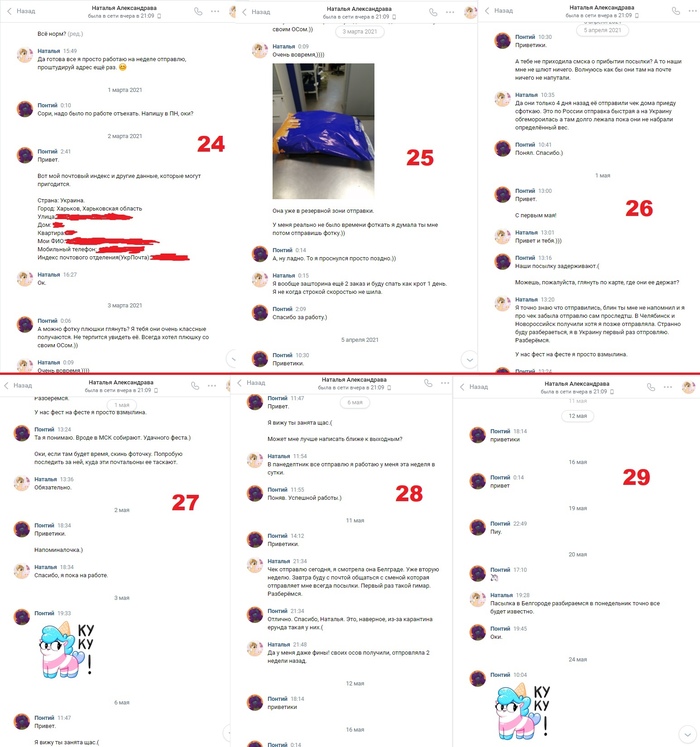 Всё шло ОК, но постепенно действия крафтерши начали вызывать у меня подозрения. Не было никаких фотографий процесса работы / готового изделия. Плюшка просто внезапно стала "Готова". Потом она её сразу отправила по почте мне, по её словам. Пол года не могла прислать мне фотографию чека с почты и так же долго выдумывала всякие отговорки и невероятные истории о путешествии моего заказа по России. Лучше будет почитать, чем я буду рассказывать своими словами.