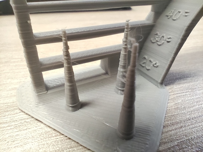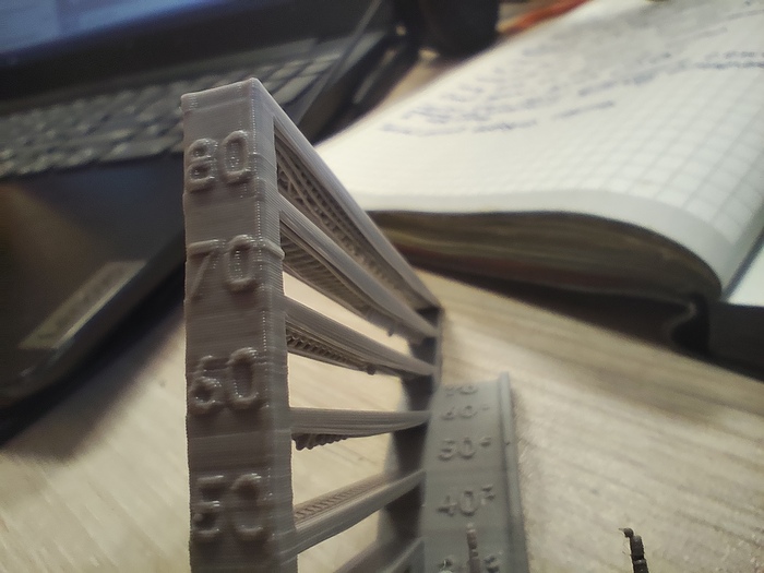 Несколько лет назад купил принтер и почти не пользовался. Решил сдуть пыль и вот результат тестовой печати. Что с ним не так, ну и с настройками? Очень пугают "съезжающие" слои возле "70", ну и пирамидки совсем плохи.