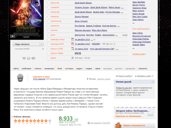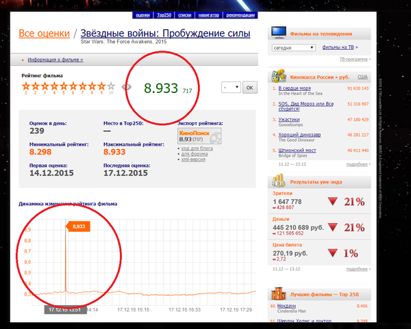 Не очень понятно, откуда взялся рейтинг 8.933 у нового эпизода "Звездных войн" на кинопоиске. На графике видно, что почти весь день, за исключением одной минуты, рейтинг находится на уровне ~8.3. Я ничего не имею против фильма, он вполне неплох, просто удивила такая высокая оценка.