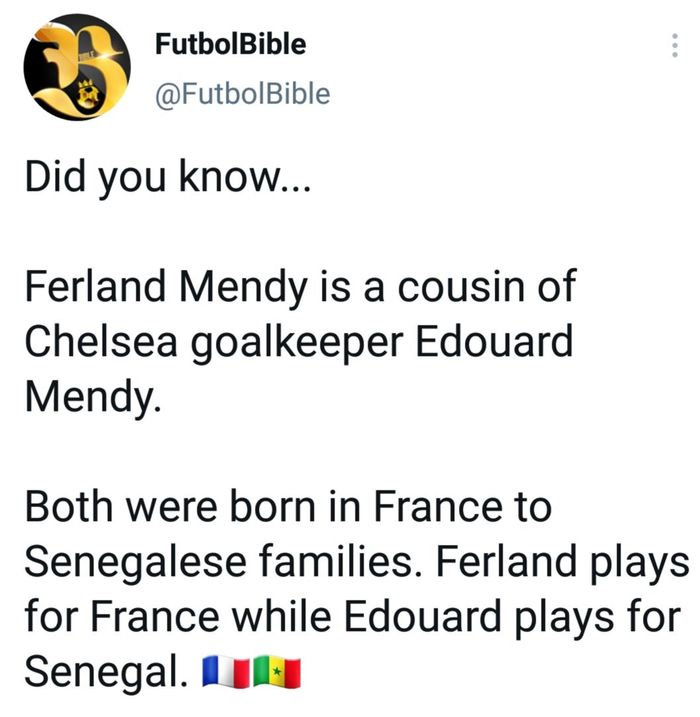 12 Oksen92 А вы знали ...? 4 года назад ✏FutbolBible:"А вы знали...Ферлан Менди - двоюродный брат голкипера Челси Эдуара Менди.Оба родились во Франции в сенегальских семьях. Ферлан играет за Францию, а Эдуар - за Сенегал"🇫🇷🇸🇳 Братья, которые сразятся друг с другом в полуфинале ЛЧ Показать полностью 2 Челси Футбол Лига чемпионов Длиннопост Ещё 0