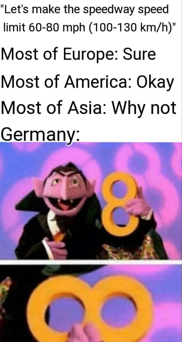 7 OldAI Про ограничение скорости 6 лет назад "Давайте введём ограничение на скорость 60-80 миль/ч (100 - 130 км/ч)"Большинство людей Европы: Конечно.Большинство людей Америки: Окей.Большинство людей Азии: Почему бы и нет.Германия: ∞ Показать полностью 1 Английский юмор Reddit