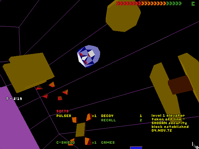 Я увидел перед собой жёлтый квадрат, обрамлённый оранжевыми ромбами, а поодаль - три медленно вращавшихся разноцветных куба. Я устремился к квадрату. Это был фрагмент данных: [04.11.2072: SHODAN инициировала блокировку главного лифта. Уровень 1. Доступ: ОТКЛЮЧЕН].