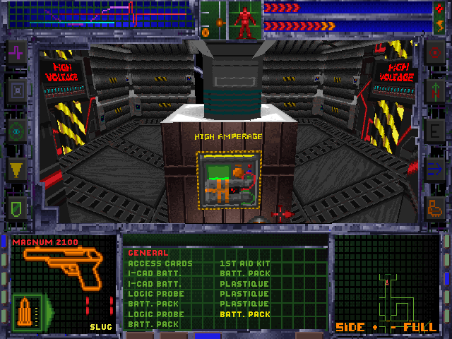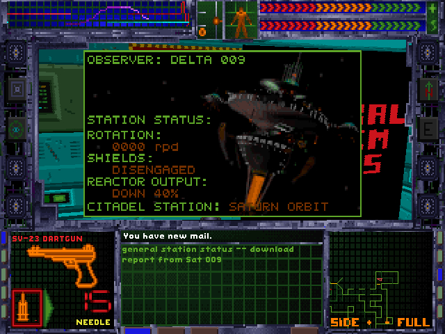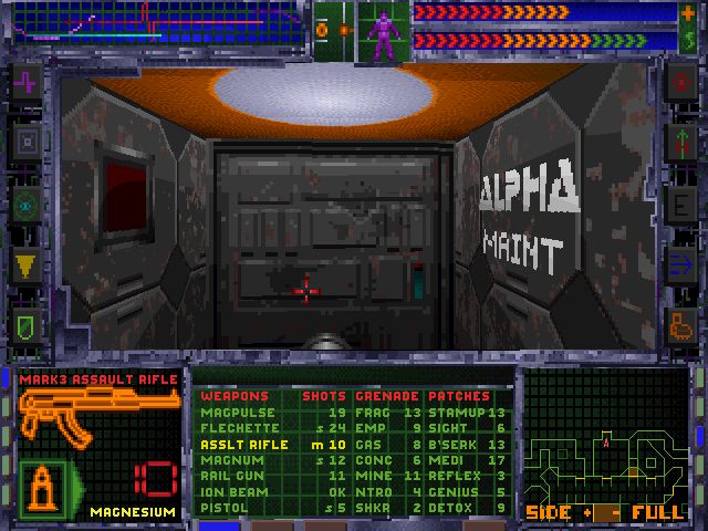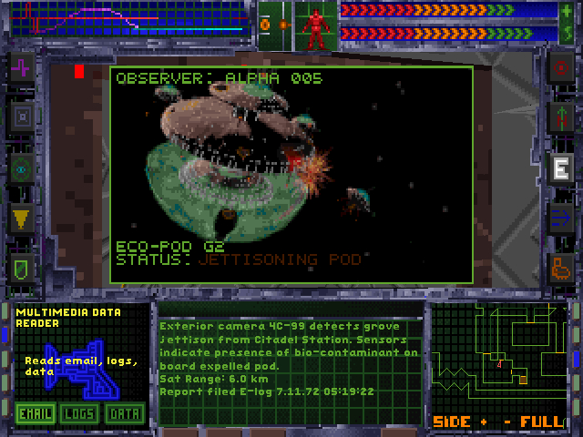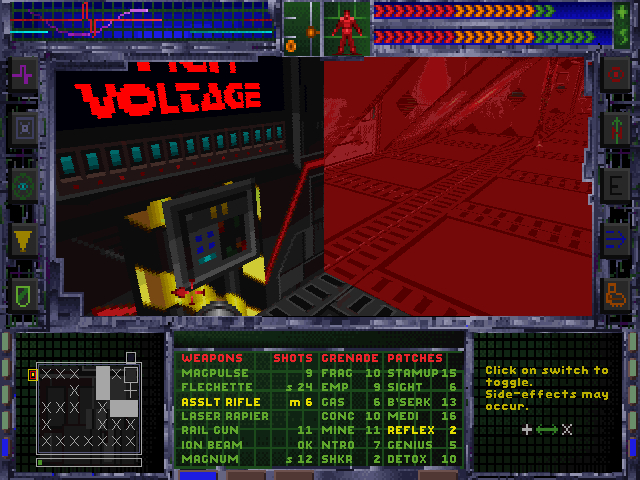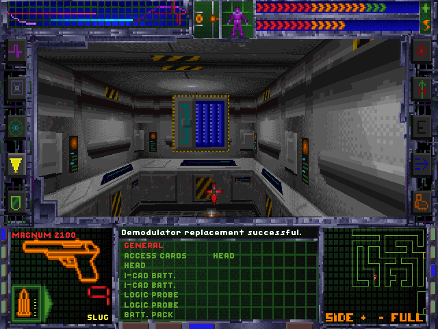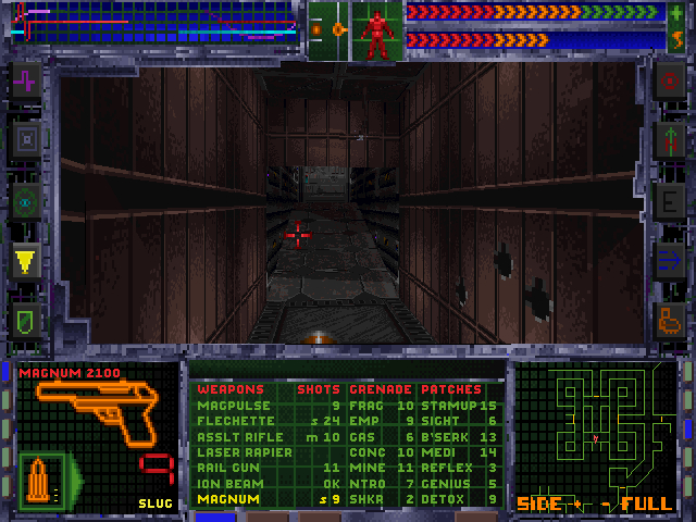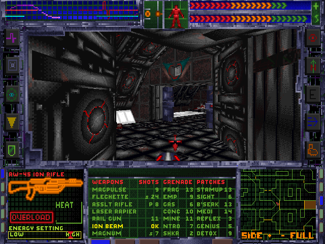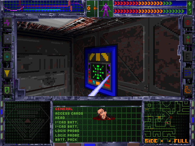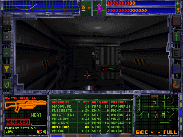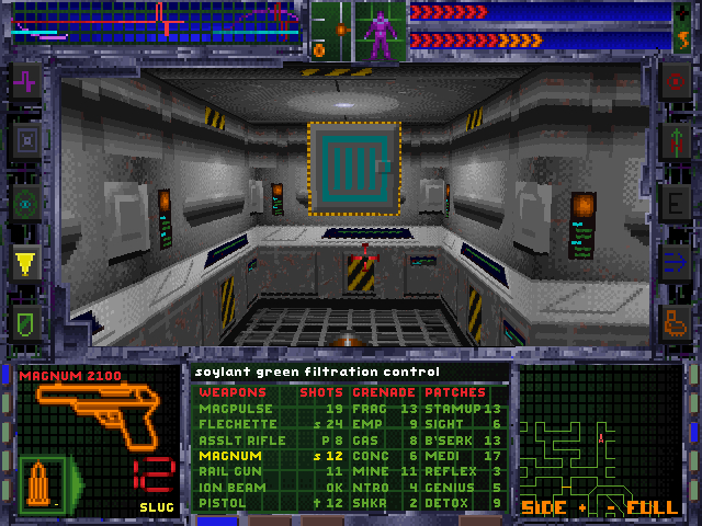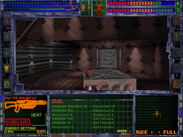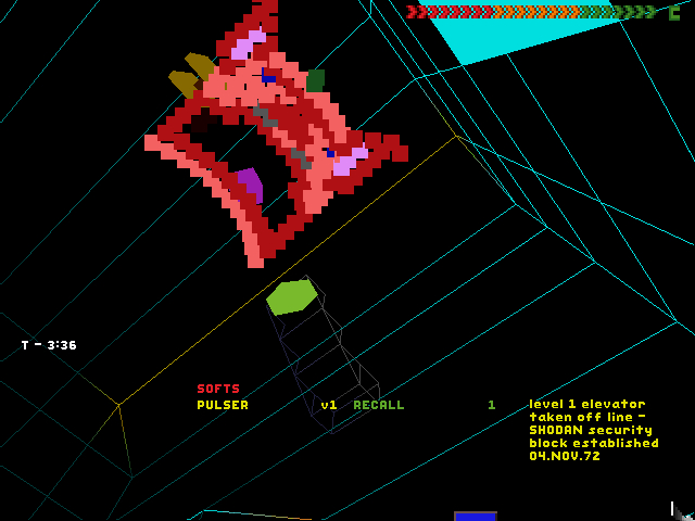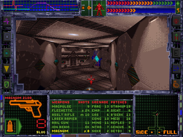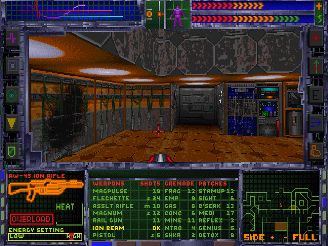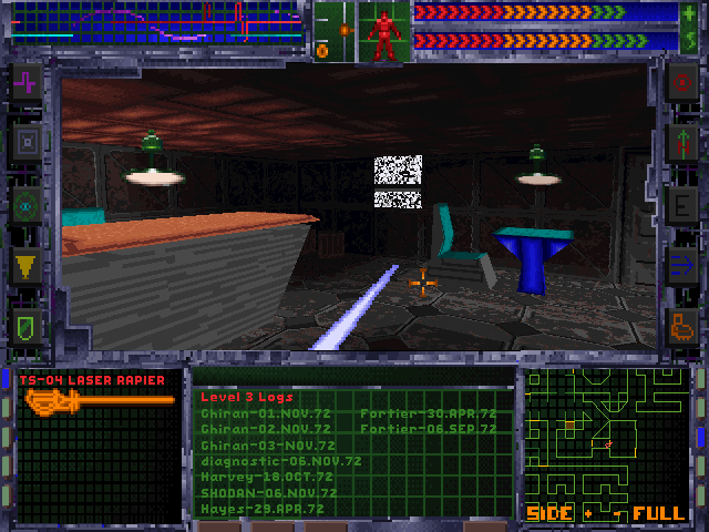 Давайте немного отвлечёмся. Теперь, когда мы как следует освоились в игре, надо сказать о том, что, несмотря на гениальные сюжетные решения и сложнейший передовой гейм-дизайн, у "System Shock" есть большой явный минус. Это управление, которое в сочетании с перегруженным интерфейсом создаёт очень высокий "порог вхождения" для новичка. Причём, само по себе это очень круто и инновационно - что прицел-курсор перемещается отдельно от самого игрока, что можно в полном 3D прыгать, ползать, бросать предметы. Более того, персонаж может приседать, ложиться, наклоняться, выглядывая из-за угла, и при этом смотреть во все стороны, не меняя выбранного положения тела! Но только представьте себе, как этим всем управлять. Если вы - новичок, и ещё не привыкли.