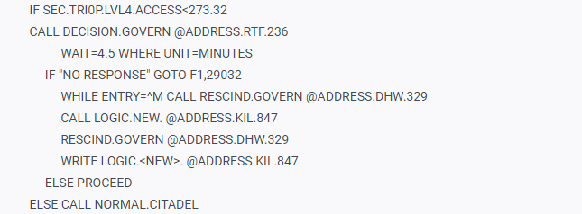 Киборгу 77-E: Немедленно на-направь роботов техобслуживания в компьютерные залы на уровнях с 1-го по 6-й для восстановления всех центральных процессоров. Если этот прихвостень "ТриОп" получит хоть одну цифру из кода авторизации системы, конкретно тебя я отправлю на Реакторный уровень без права на подзарядку и ремонт.