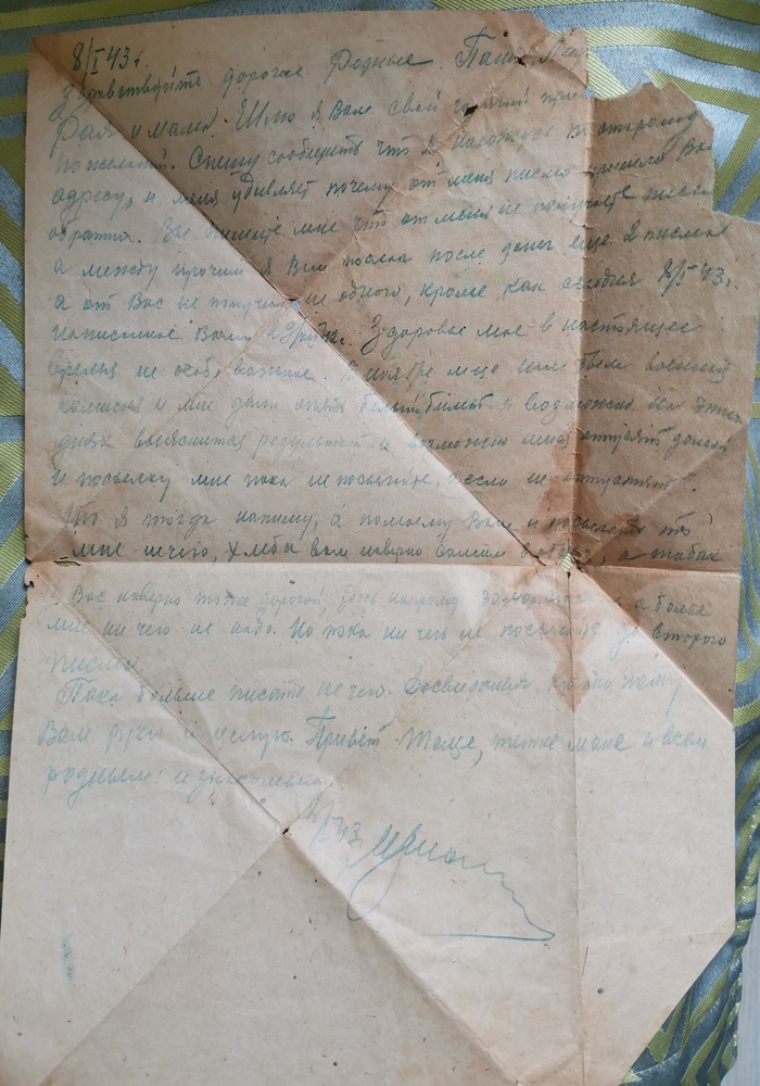 Здравствуйте дорогие Родные Паша, Лида ... (Шура), Рая и мама. Шлю я Вам свой горячий привет (....) пожеланий. Спешу сообщить что я нахожусь по старому адресу, и меня удивляет почему от меня письмо пришло Вам обратно. Вы пишите мне что от меня не получаете письма, а между прочим я Вам пошлю после денег еще 2 письма а от Вас не получил ни одного, кроме как сегодня 8/1/43 написаное Вами 29/??/42. Здоровье мое в настоящее время не особо важное. В ноябре еще была военная комиссия и мне опять дали белый билет и возможно на этих днях выяснится результат и возможно меня отпустят домой. И посылку мне пока не присылайте, если не отпустят я тогда напишу, а помоему Вам и посылать то мне нечего, хлеба вам наверно самим в обрез, а табак у Вас наверно тоже дорогой, здесь например 30-40 р (...стакан?), а более мне ничего не надо. Но пока ничего не посылайте до второго письма.