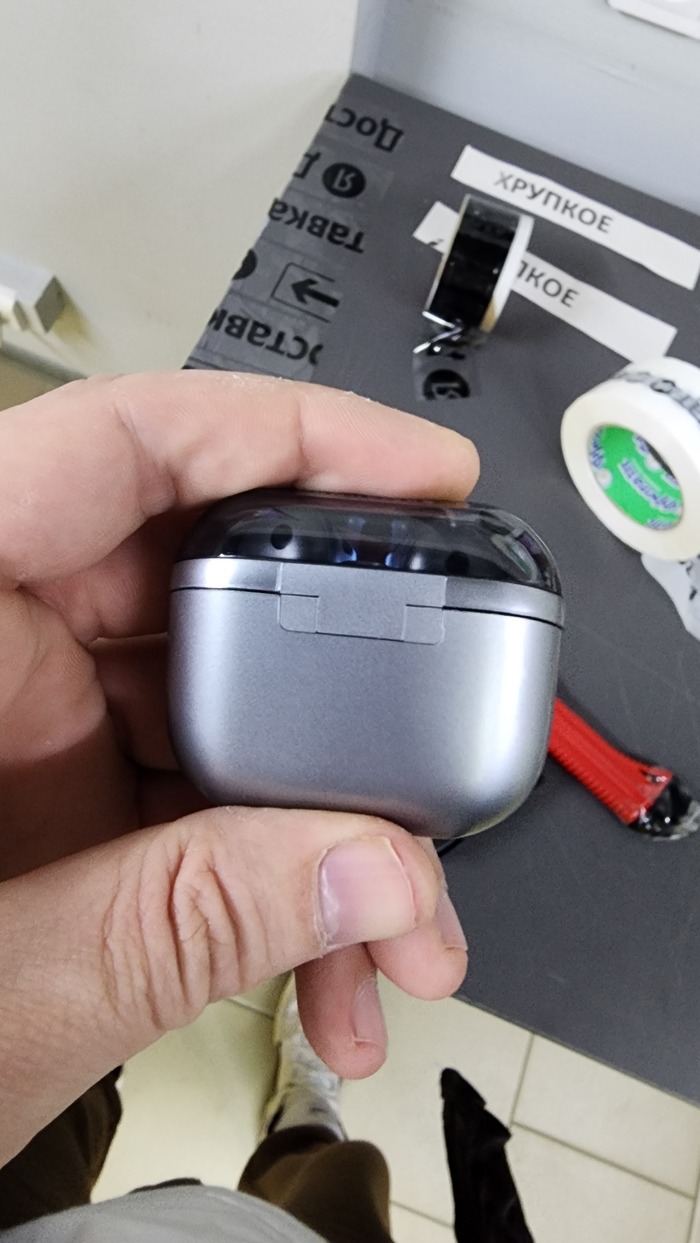 Сам кейс наушников отвратительного качества, дешёвый, окрашен крайне отвратительно, с недокрасами, ощущение, будто ногтем можно поцарапать. Наушники светятся насквозь, т.е. они просвечивают через лампу света.