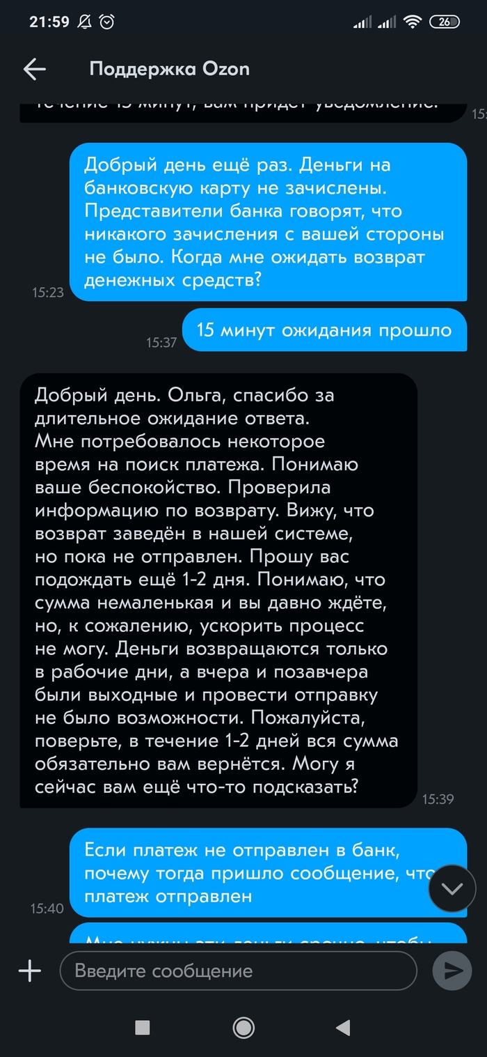Однако, не все так просто. Прошли выходные. Деньги в банк не поступали. И прежде чем ругаться с озоном, я позвонила в банк. В банке мне ответили, что никаких переводов не было. Далее приводится переписка с озоном, из которой выясняется, что возврат в их системе заведен, но деньги не отправлены. И начинаются отписки.