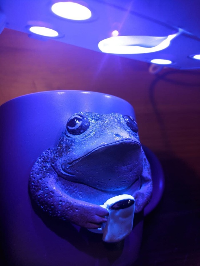 Я решила добавить ей в лапки чашку с кофе, чтобы было нечто среднее между мемом "папей гавна" и "я добавила твоей жабе кофе, чтобы, пока ты пьешь кофе, смотреть как она пьет кофе". Ну и заодно передать настроение перед началом рабочего дня (не знаю, как вы, но я выгляжу так же).