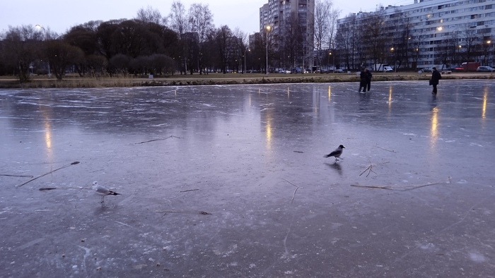 Сегодня немного мороза выдали. Вместо луж - лед. Озеро с народным названием Лимпопо стало пешеходным не только для птиц, но и для безбашенных подростков.
