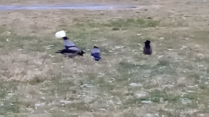 Вороны вдалеке сражаются за право доесть вкусняшку из пластикового стаканчика. На зуме телефон снимает нечетко.