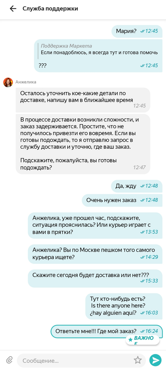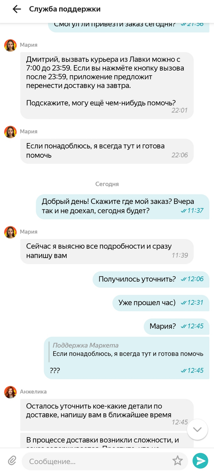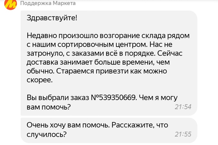 Заказал корм для кошек в яндекс маркете, заказ должен был приехать вчера в 16 часов в ближайшую лавку и далее по клику ко мне домой. Приходит предпологаемое время и тишина.... В 22 часа я интересуюсь у поддержки где мой заказ. На что мне сходу приходит очень интерессный ответ: