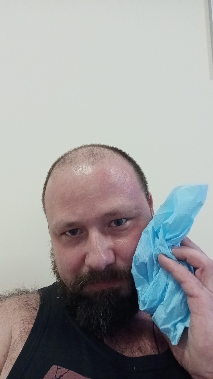 По поводу медленного набора формы: предполагаю, что изначально, когда начал силовой цикл, был сильно измотанным в физическом и ментальном плане (а ресурсный "котелок" ЦНС один на все так-то), к этому верхом легла вначале одна хворь с лечением антибиотиками, а тут еще неделю назад выдался шанс дернуть предпоследний зуб мудрости (Пы.Сы. вопрос с которым был не критичным, но назревал довольно давно) (Пы. Пы. Сы. теперь тупой хожу) у медицинской светилы, чем я не преминул воспользоваться. В итоге снова антибиотики, неделя перерыва, обезбол и все прочие прелести восстановления здоровья. Ниже вот он я с раскуроченной челюстью. И бытовыми способами снять воспаления наружного и внутреннего применения.