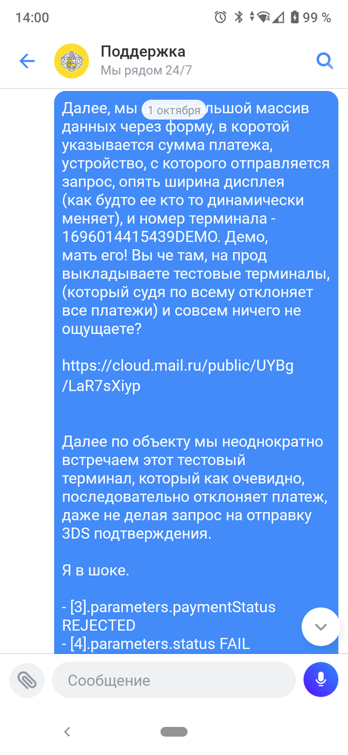 - Ииии ничего! Платеж вываливается в ошибку, даже не доходя до стадии подтверждения (ну вы знаете, надо подтвердить СМСкой, или через Push код, который приходит на телефон)