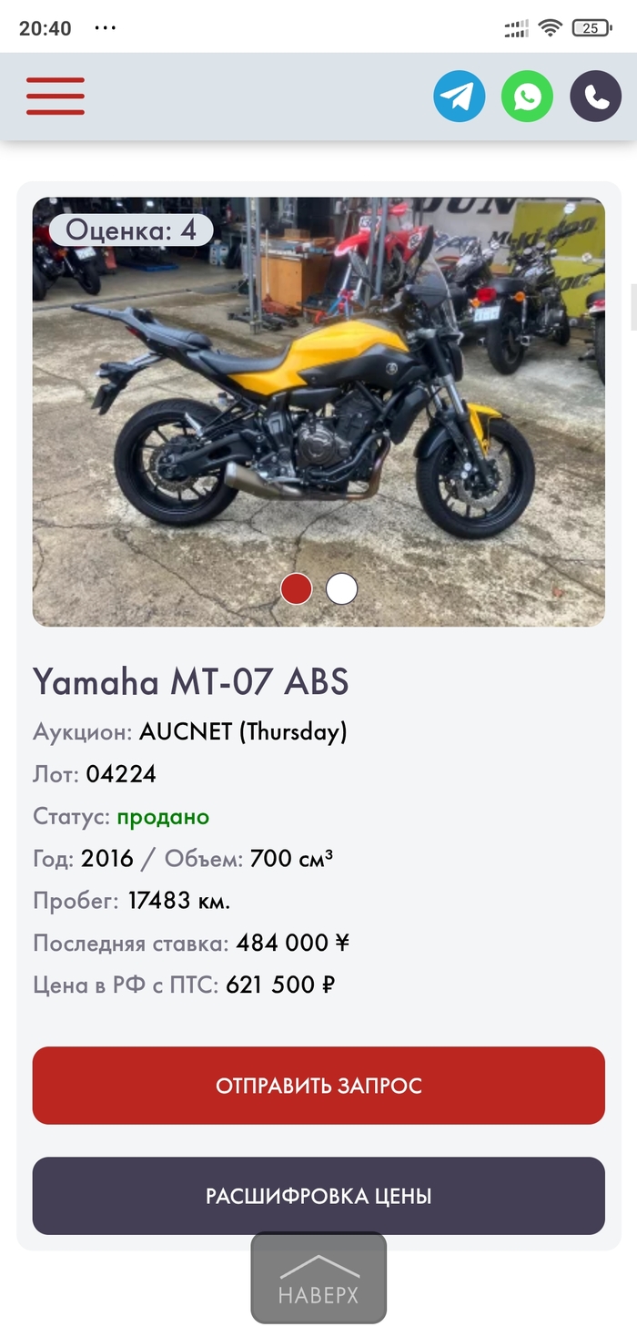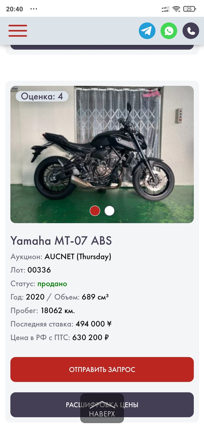И так захотелось мне в это лето заехать на мотоцикле а конкретно на yamaha mt07, начал я смотреть российский рынок и конечно все очень печально, цены достаточно высокие 650-750 тысяч за мотик 2014 +- года, ну думаю ладно впринципе цена может и высокая но все же вполне себе в разумных пределах. Начал подробно изучать что продается и естественно все что по средней цене с нюансами, ну думаю ладно, загляну на японские аукционы и посмотрю сколько такие же мотоциклы стоят там и соответственно сколько будут стоить у нас с растаможкой, ПТС, доставкой и прочим, короче говоря под ключ. И так имеем следующее, много скринов добавлять не буду но суть будет и так понятна.