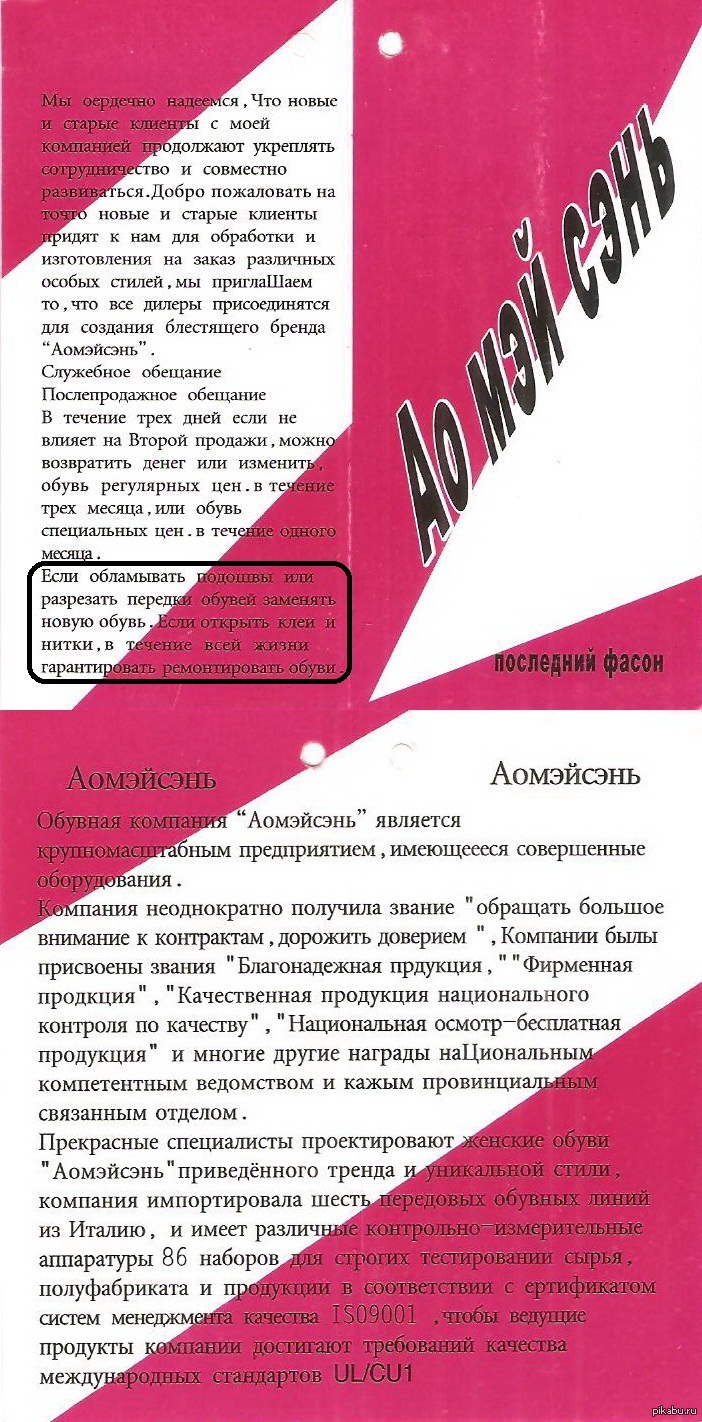 0 Ooitsnasof Ярлык от китайской обуви 11 лет назад Нашел у бабушки ярлык от китайских башмаков. Смысл текста не поддается понятию, как и суть его там размещения. Китай Обувь Ярлыки Слова