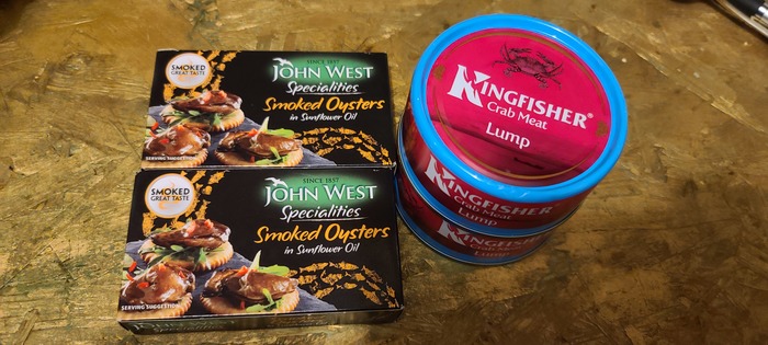 Я беру 3-4 бутылочки разного коньяка из серванта, пару упаковок копченых устриц,и мясо крабов.