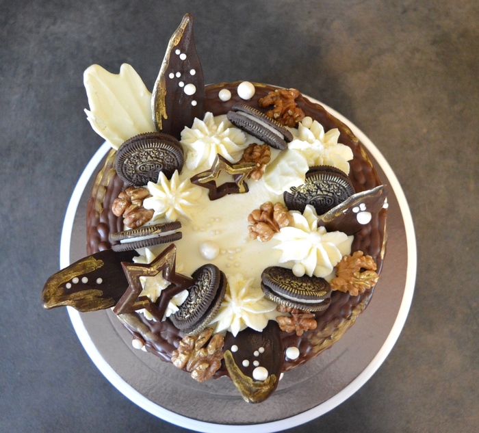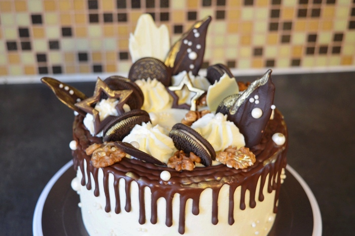 В конце октября я все же сделала то, чем немножко горжусь! Мой почти ровный, симпатичный торт! Здесь есть звёзды и лепестки из укрощенного шоколада, красивые потёки и эксперименты с кандурином (это золотая краска). И фигульки не поплыли! (Печеньки - как настоящие. Потому что настоящие). Вот фото со всех сторон))