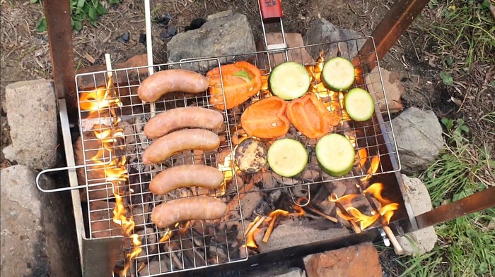 Решили мы с мужем поехать на, первые в этом году, шашлыки. Так как мангала своего не было, а крупными свободными средствами мы не располагали - взяли самый дешёвенький в местной торговой сети. Взяли с расчётом, что на пару раз должно хватить. Показался хлипковат, но решили рискнуть. Установили, загрузили небольшим количеством съестного, и стал он выглядеть примерно так: