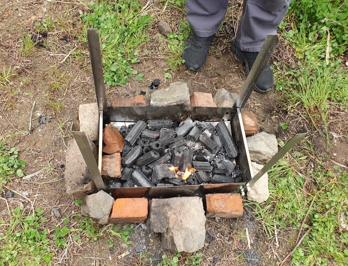 Но как только угли немного прогорели, и возникла необходимость "пошурудить" их, дно этой конструкции весело... рухнуло вниз, рассыпая угли кругом. И обратной сборке, увы, не подлежало. Рассстроенный муж уж собрался было домой, но для сохранения возможности набить животы сочными мясцом и овощами, быстренько было внесено встречное предложение. А именно, перевернуть оставшуюся часть конструкции, и обложить, найденными в округе, камнями по периметру. Собственно, вот что из этого вышло: