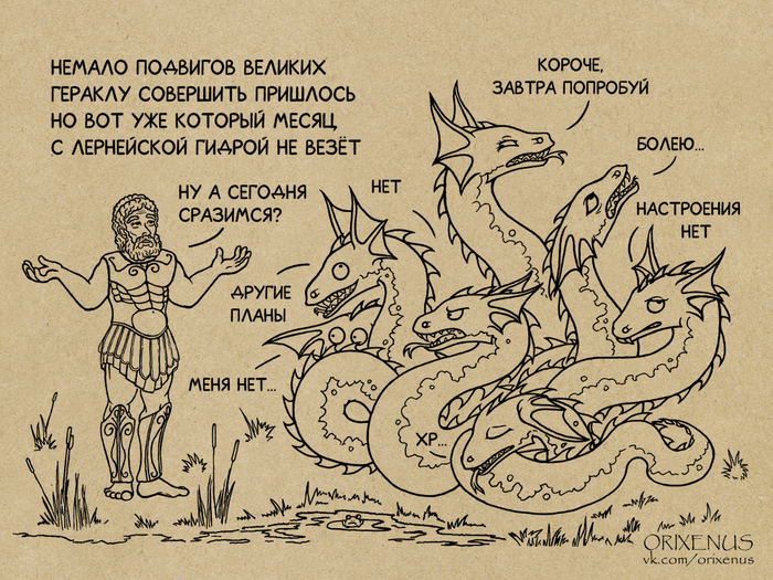 Близнецы (июнь). Если бы Геракл не лез в драку сразу, а сперва интересовался мнением чудовищ по этому поводу, было бы как-то так. В основе картинки - миф о Лернейской гидре (один из 12 подвигов Геракла). Кстати, этому мифу мы обязаны появлением Зодиакального созвездия - но, внезапно, рака.