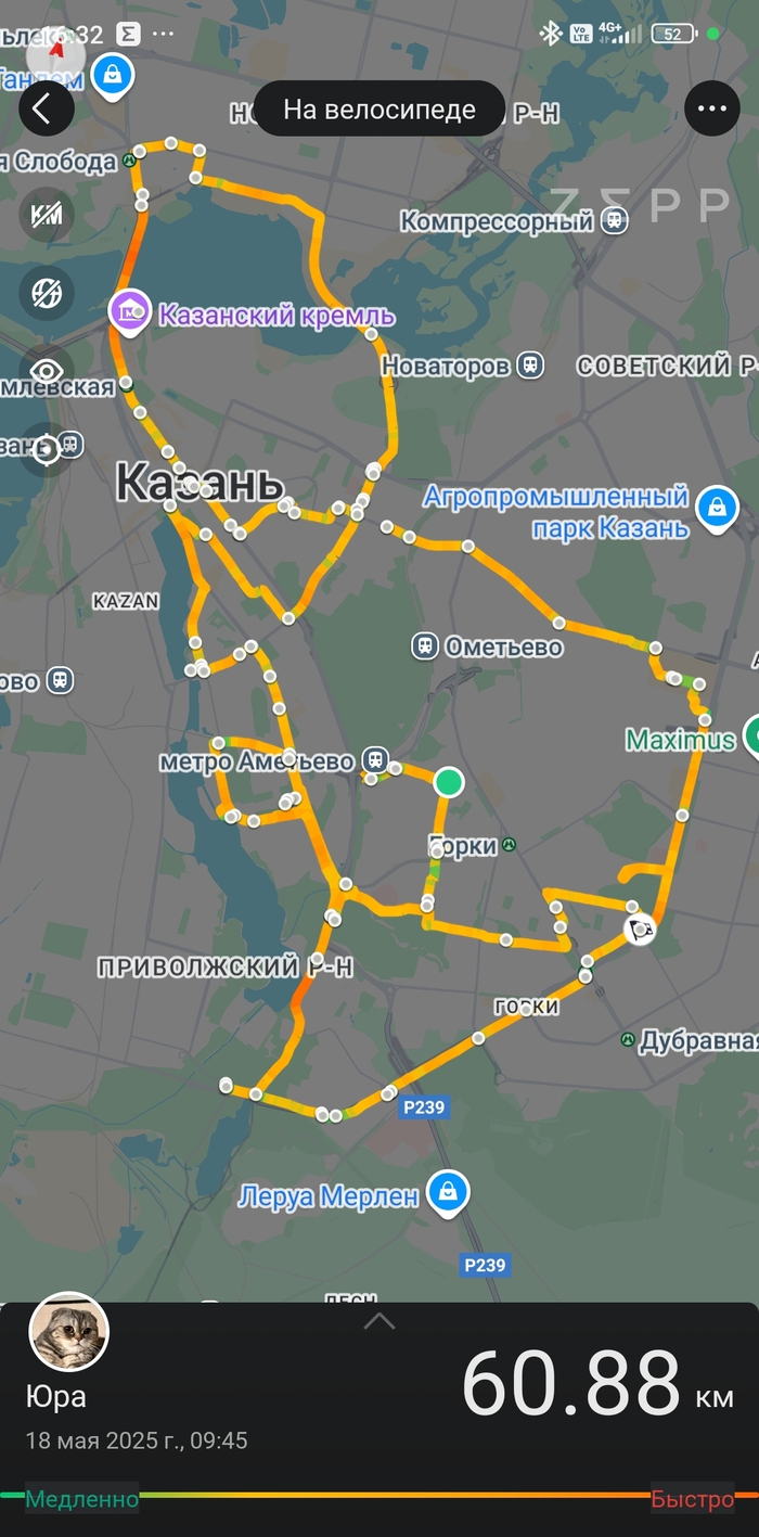 За 1ч 50мин , не торопясь, проделал путь 17км от дома до вокзала по утренней прохладе и с минимум пешеходов на улицах, прекрасно прокатился! В сквере у вокзала отдыхал на лавке пока не высохла спина.