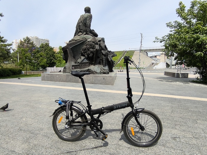 Делюсь опытом перевозки складного велосипеда в поезде РЖД. Велосипед складной, модели stern town 20, на 20х колёсах, есть у меня пост про него. Решил я его в поезде прокатить с собой в купейном вагоне. На вокзал было принято решение ехать прямо на нём, расстояние до вокзала 17км, с собой сумка с вещами 5кг примерный вес, плюс рюкзак с ноутбуком и прочей электроникой 3кг, собственный вес 100кг.