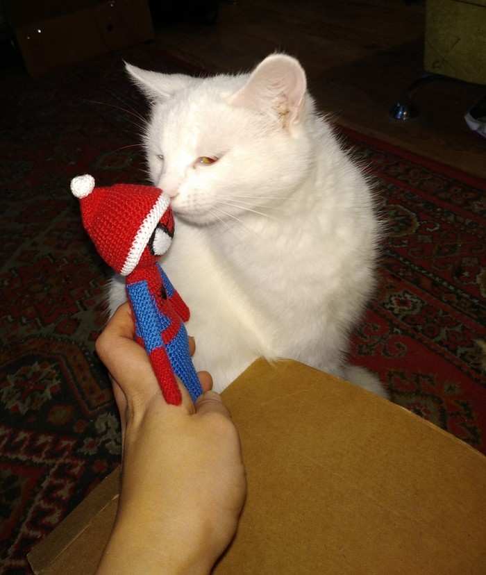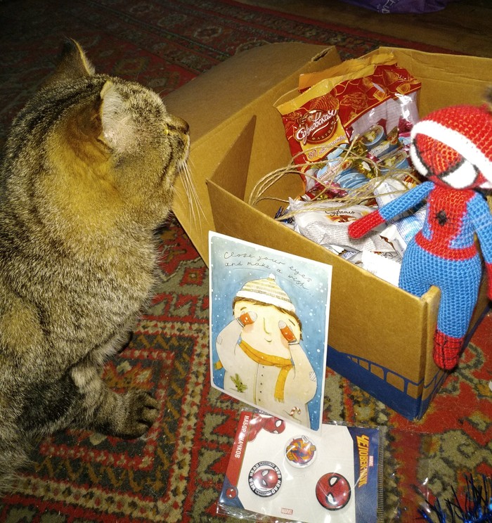 В коробке оказался... Вязанный Человек-паук, я его обожаю! Это моя страсть и слабость. Он ещё и ручной работы? Дедушка, признавайся, ты сам его вязал, да? Он занял почетное место около картины Человека-паука! 🕷️