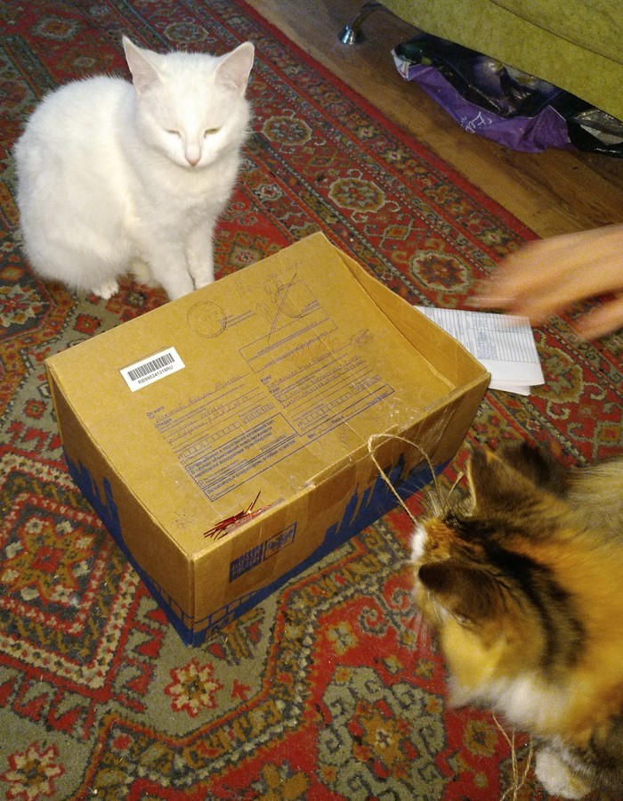 Кажется, посылка настолько понравилась котикам, что они позвали третьего, чтобы тщательно исследовать коробочку, а вдруг там завалялся лишний пакетик вискаса?