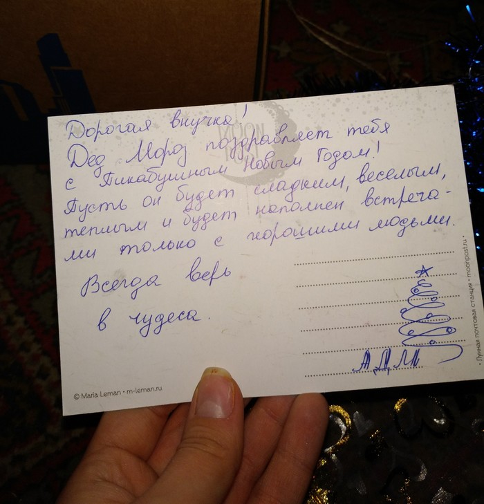 Мы вскрыли посылку. Первое, что попалось ко мне на глаза, была открытка, подписанная от руки. Увидев сие произведение искусства, я невольно расплылась в улыбке. Очень приятно!