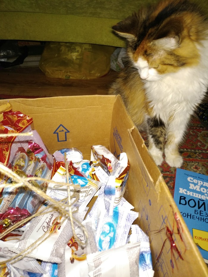 Котики расстроились, ибо еда там была только человеческая! Сладкая, шоколадная и очень вкусная. Целая гора конфет! Хоть бы теперь влезть в платье к новому году...