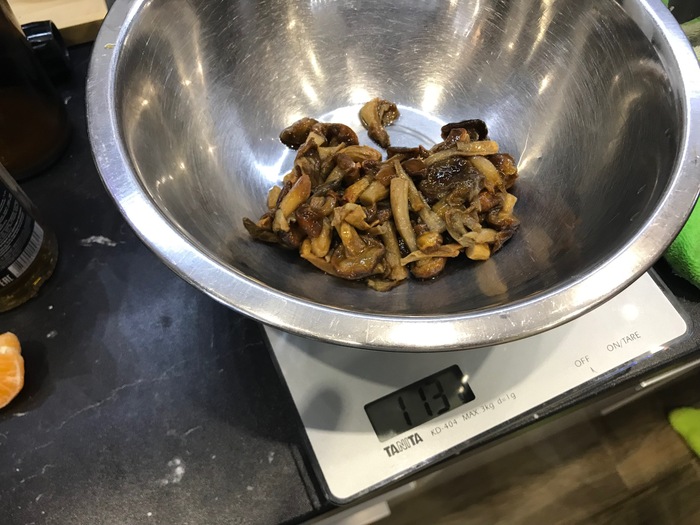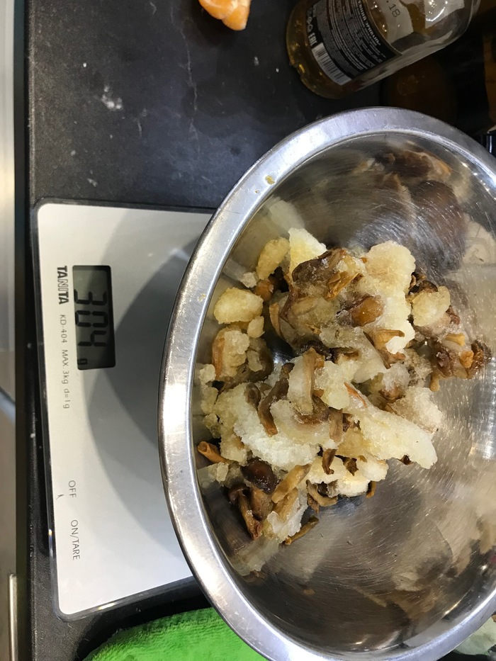 Очередное взвешивание. Итог 113 грамм грибов, 191 грамм грибной воды