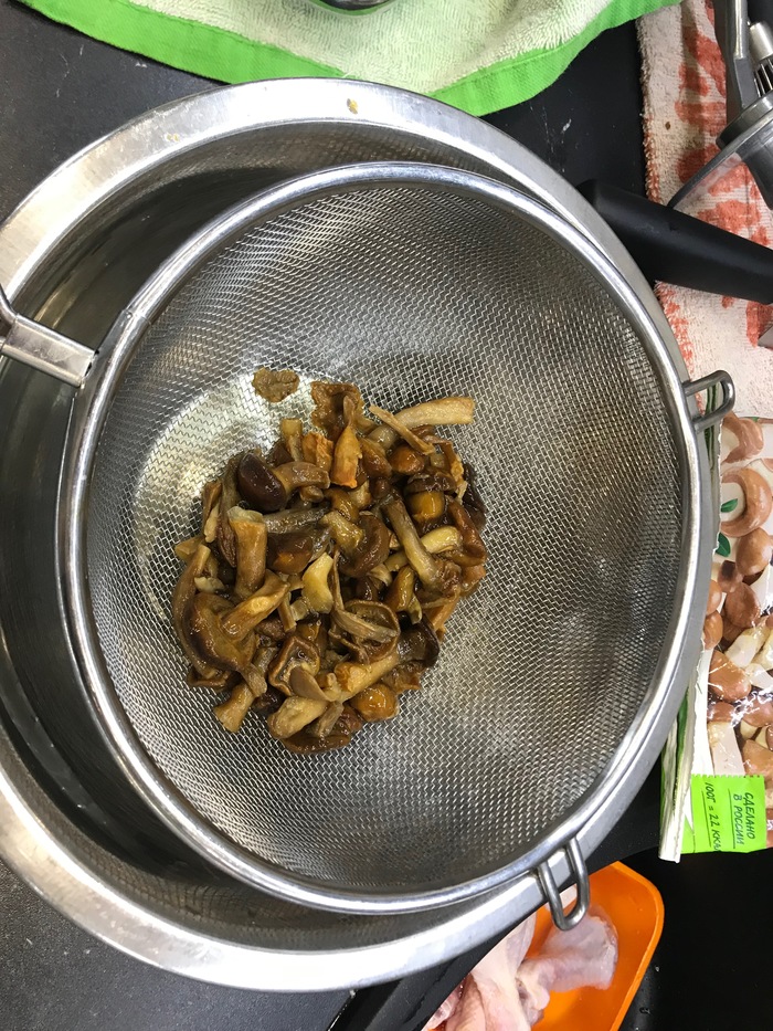 Оттаивавшие грибы откинул на дуршлаг, 3 мин на стекание воды