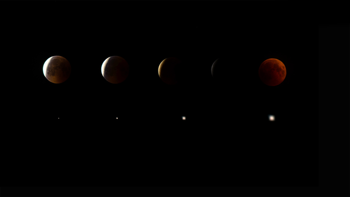 т.к. Луна уже выходила с тени Земли и была освещена неравномерно, для избежания пересветов и появления в кадре звёзд, пришлось совместить несколько экспозиций.